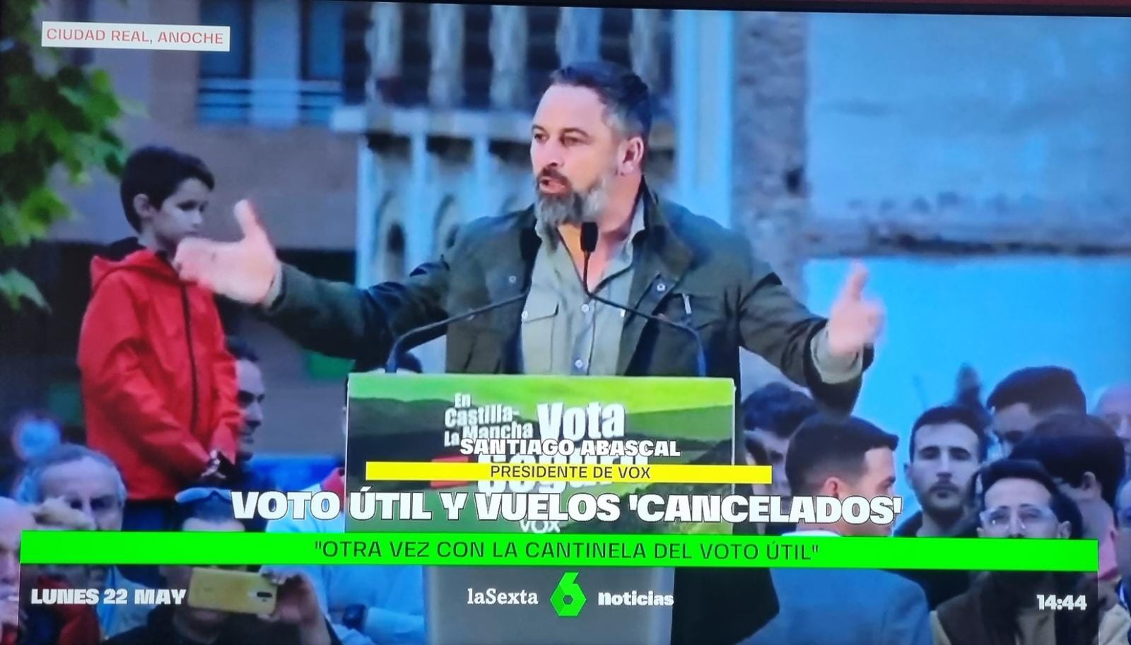 Curiosamente, La Sexta, en su informativo de este mediodía, cometía el mismo error y ubicaba a Abascal como que hablaba desde «Ciudad Real, anoche», si bien las imágenes eran del mitin que tuvo lugar en Albacete, en el que contestó al presidente del PP, Alberto Núñez Feijóo, que al mediodía en Valencia había pedido a los votantes de Vox que depositaran su confianza en el PP.