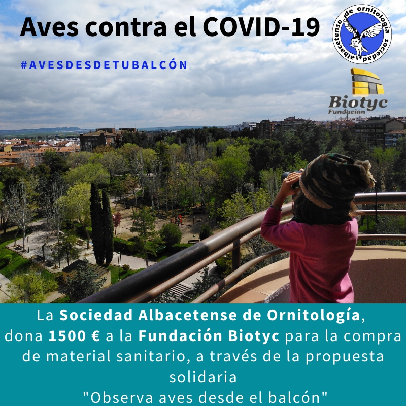 La SAO, Sociedad Albacetense de Ornitología, ha donado 1500 € a la Fundación Biotyc para la adquisición de material sanitario en el Hospital General de Albacete, con el fin de contribuir en la lucha contra la pandemia COVID-19.