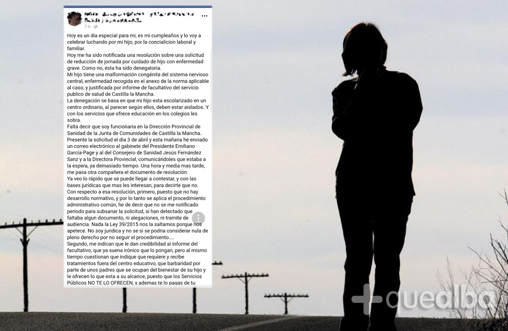 En estos tiempos de notas de prensa enviadas desde el Gobierno regional hablando del Plan Concilia y poniendo por bandera su apuesta por la conciliación de la vida familiar y laboral o las oportunidades de igualdad, llama la atención la carta de queja desesperada que una madre albaceteña, con un hijo enfermo, ha compartido en las redes sociales para denunciar que la Junta de Comunidades, de la que es funcionaria en Sanidad, le deniega una reducción de jornada que pidió para poder atender todavía mejor a su hijo.
