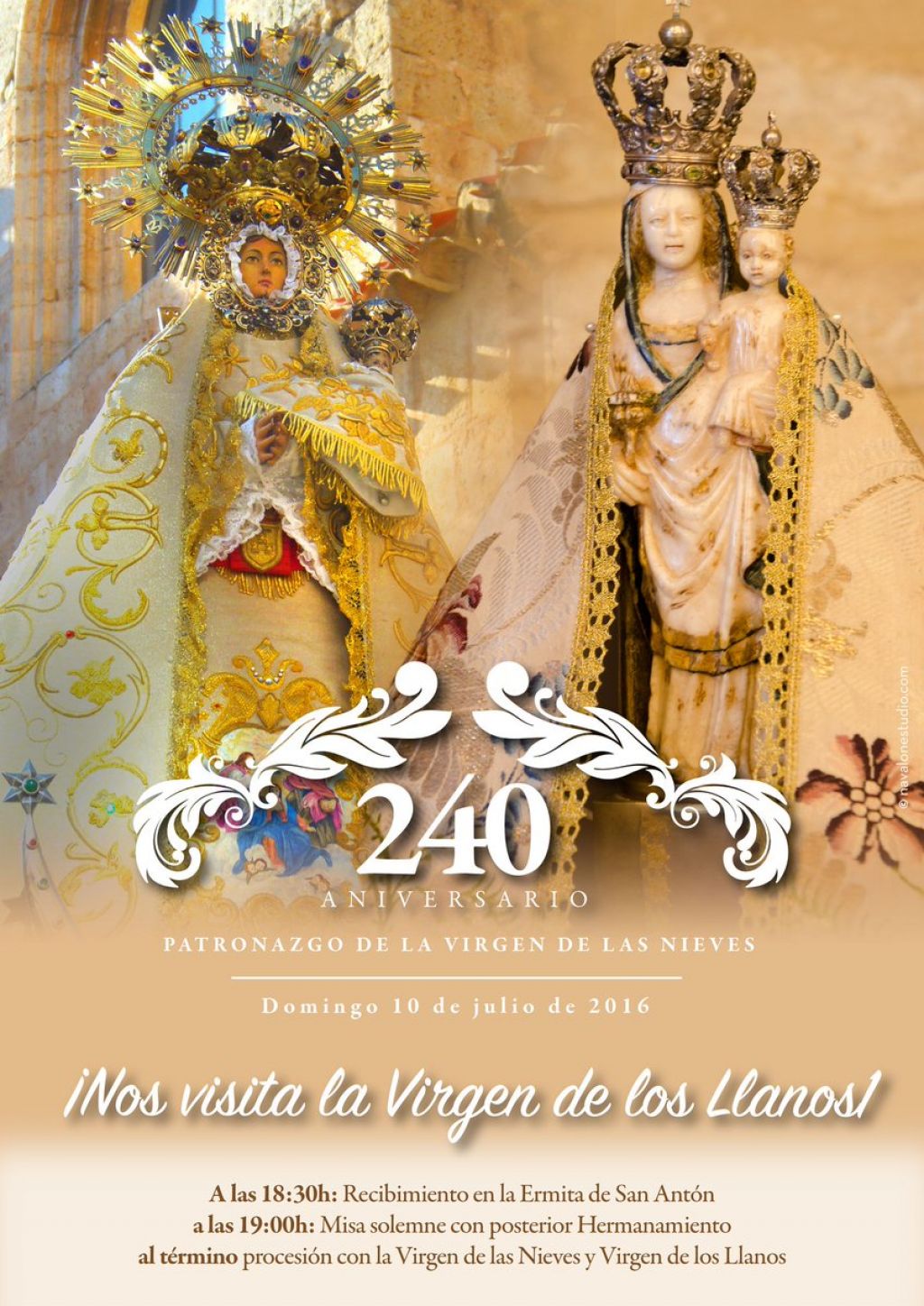 La imagen de la patrona de Albacete, la Virgen de los Llanos, visitará por primera vez la vecina localidad de Chinchilla de Montearagón este domingo, 10 de julio. A las 18.30 horas tendrá lugar el recibimiento en la Ermita de San Antón y habrá una misa posterior, tras la que habrá una procesión con la Virgen de las Nieves y la Virgen de los Llanos.