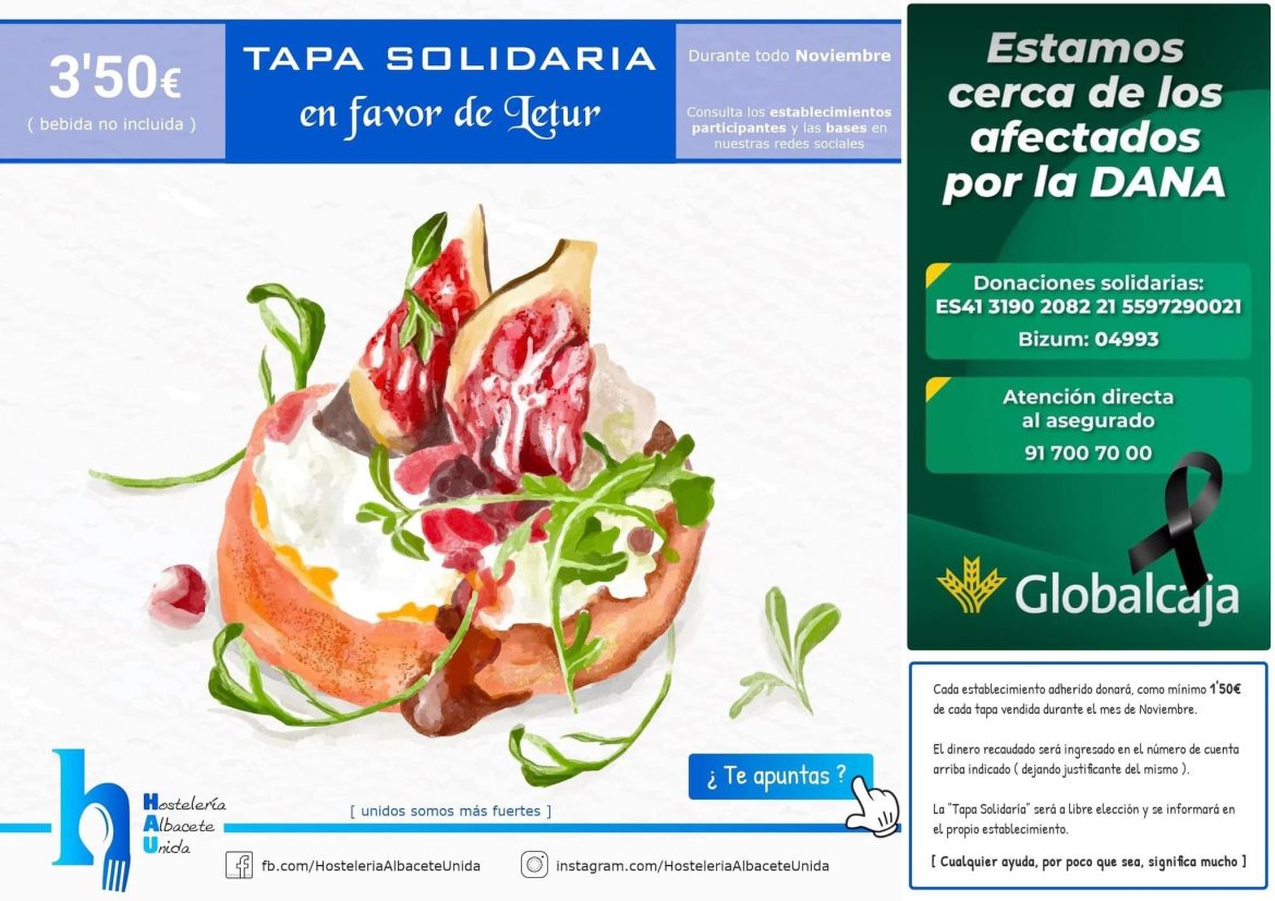 Y por otro lado, para recaudar estos fondos con destino a los vecinos y vecinas de Letur, Hostelería de Albacete Unida ha puesto en marcha la campaña Tapa Solidaria, ofreciendo tapas al precio de 3,50 euros, de los que al menos 1,50 euros se destinan a los damnificados por la DANA. Esta campaña estará activa durante todo el mes de noviembre, de lunes a domingo.