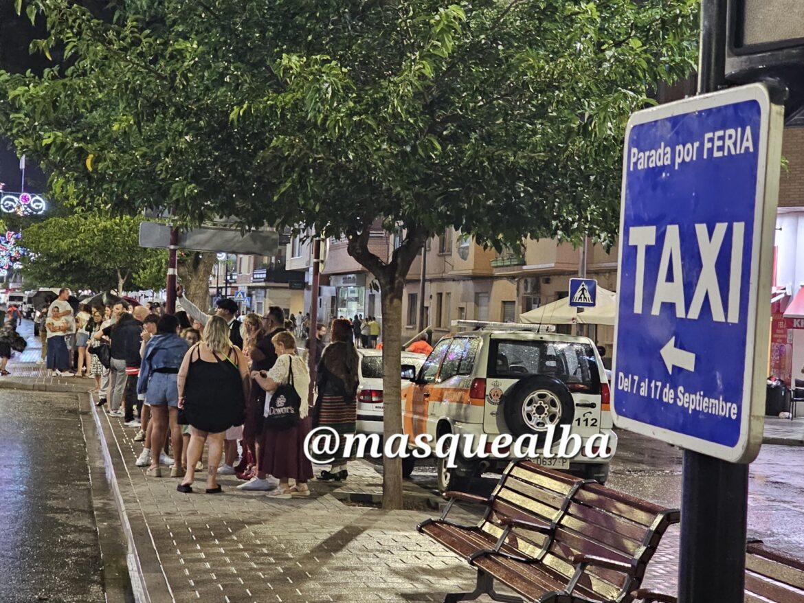 Sábado de Feria, primer día de fiesta, y jornada de mucho trabajo para los taxistas de Albacete. A primera hora de la madrugada, la cola de quienes esperaban para conseguir un Taxi en la Feria de Albacete era muy importante.