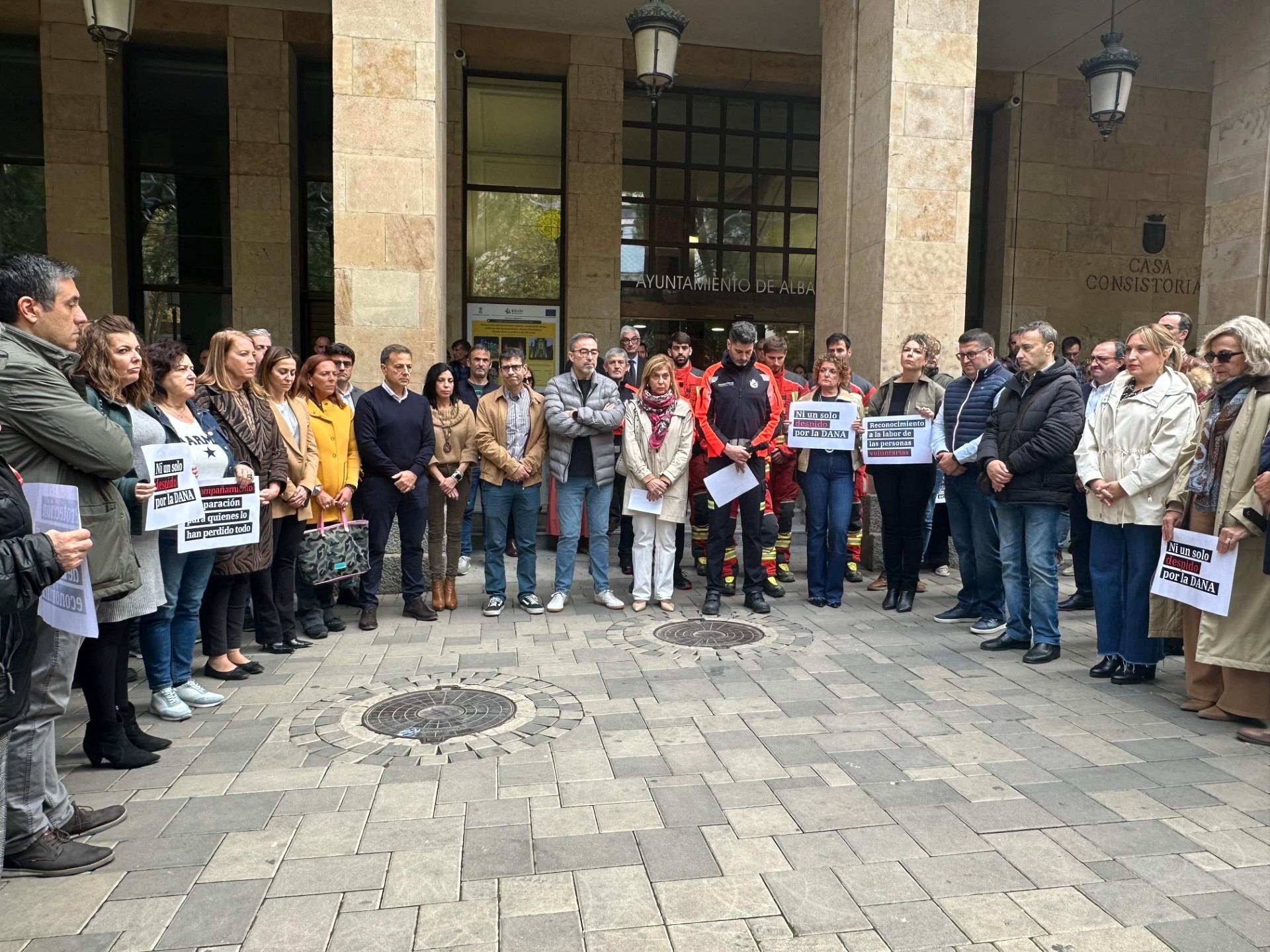 En la puerta del Ayuntamiento de Albacete, donde un bombero ha dado lectura al manifiesto en apoyo de los afectados por la DANA, los encargados de atender a los medios han sido los representantes de los sindicatos CCOO y UGT. Aquí han estado el secretario regional de CCOO, Francisco de la Rosa; el responsable de UGT en Albacete, Javier González; y la secretaria de CCOO en Albacete, Carmen Juste.