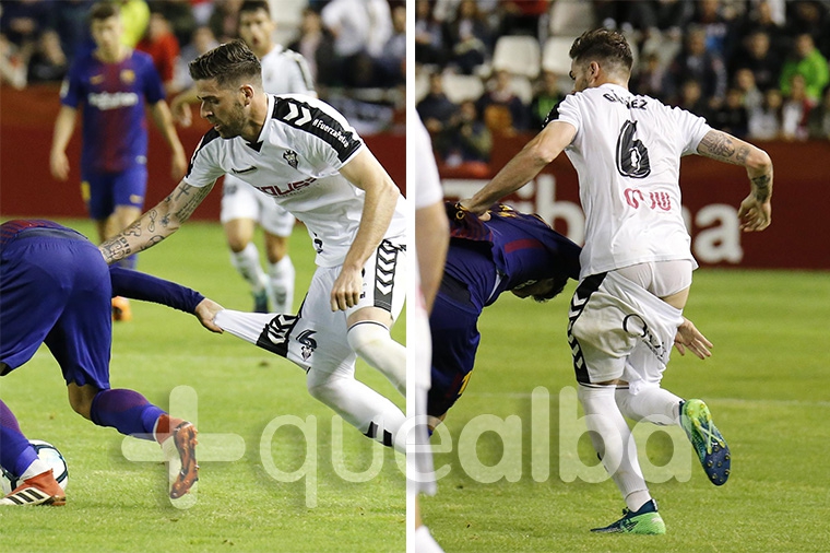 | Zozulia se bebió el agua del meta rival.- En la segunda mitad, el delantero del Albacete Balompié Zozulia tomaba fuerzas con el agua de Ortolá, el guardameta del Barça B. | ![]() |