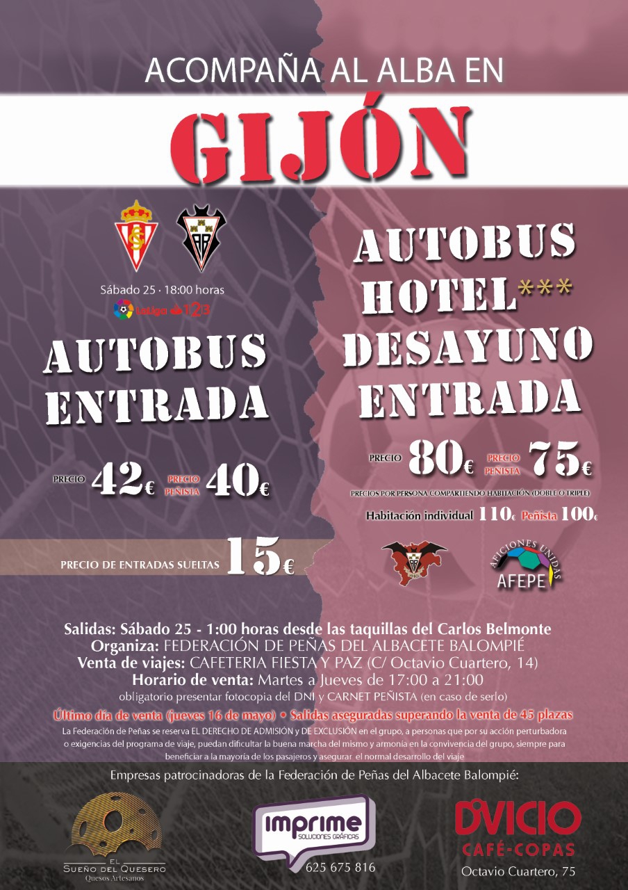 La Federación de Peñas del Albacete Balompié ha organizado viaje a Gijón para seguir al Alba en su importante desplazamiento. Está la opción con hotel o sólo autobús y entrada.