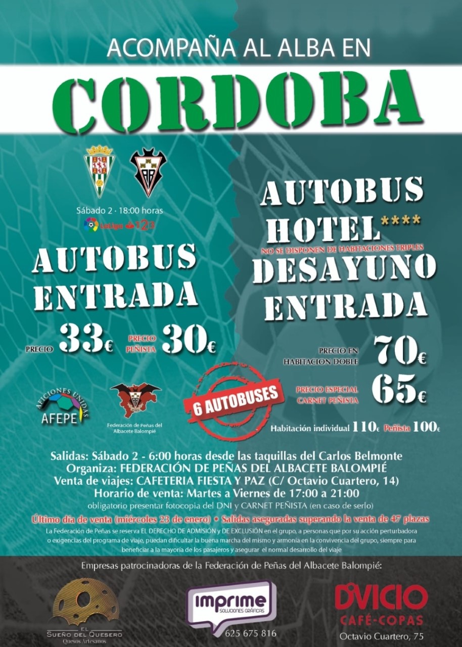 Para acompañar al Albacete Balompié S.A.D hasta Córdoba el próximo 2 de febrero, la Federación de Peñas prepara dos opciones: hacerlo en el día o aprovechando el fin de semana y visitar la ciudad alojándote en un hotel de 4 estrellas con desayuno incluido, desde mañana hasta el próximo miércoles 23 de enero estarán vendiendo dicho desplazamiento en el horario indicado en el cartel.