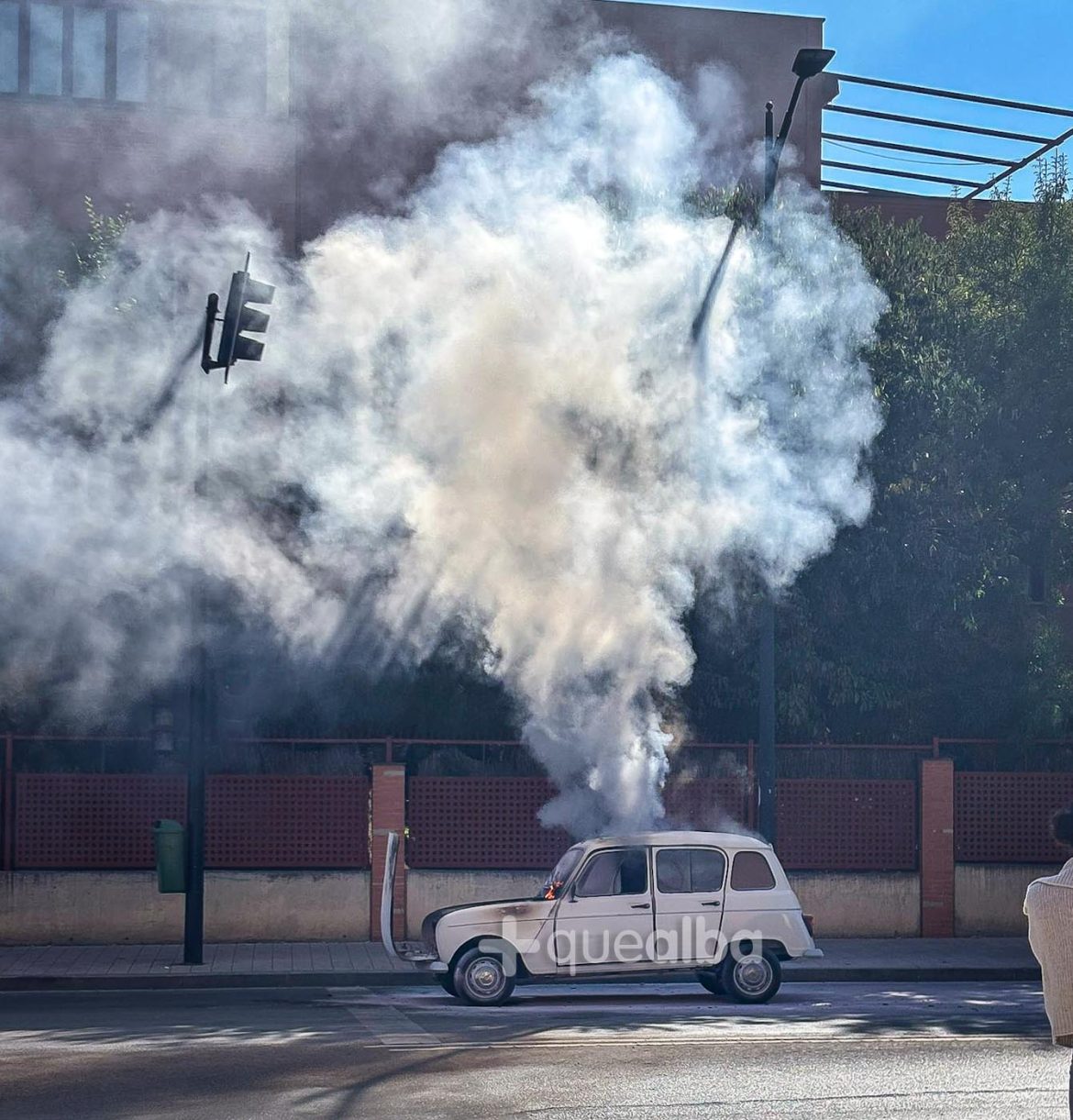 Llamativo suceso el que se han encontrado este martes quienes caminaban por la carretera de Peñas, al cruzar la Circunvalación de Albacete. Un mítico R4 ardía en llamas.