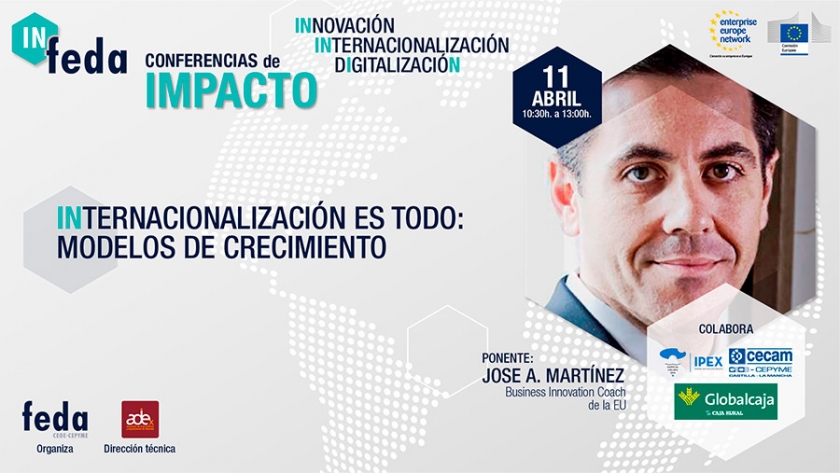 Continúa el programa “IN-FEDA 2019. Conferencias de Impacto. Innovación-Internacionalización-Digitalización”, con la segunda sesión. El jueves día 11 de abril, a las 10,30 horas. Con la colaboración de Globalcaja y la participación de IPEX y CECAM.