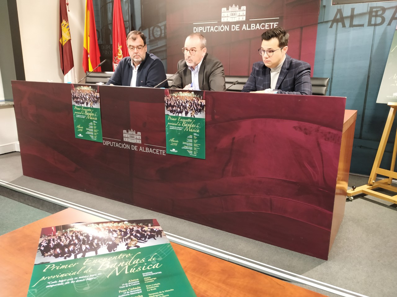 La Diputación de Albacete ha presentado hoy el que será el ‘I Encuentro Provincial de Bandas de Música’, actividad que se desarrollará durante los días 15, 16 y 22 de este mes y que servirá para poner en valor la “cantidad, calidad y variedad de actividades que las bandas, academias y escuelas municipales de música de Albacete realizan durante todo el año”, así lo ha explicado el diputado de Cultura y vicepresidente de la Diputación, Alberto González, que ha comparecido en rueda de prensa junto a los alcaldes de Tarazona de la Mancha y Villalgordo del Júcar, Miguel Zamora y José Luis Martínez, respectivamente, para hablar de esta iniciativa cultural que, por primera vez, ve la luz en nuestra provincia y que se debe, en gran medida, ha explicado González, a la implicación del presidente de la institución provincial, Santiago Cabañero, con la ‘cultura de las bandas’ y con todo lo que éstas aportan a los municipios a nivel musical, cultural, educativo y también de convivencia entre las y los músicos, y la ciudadanía de nuestros pueblos.