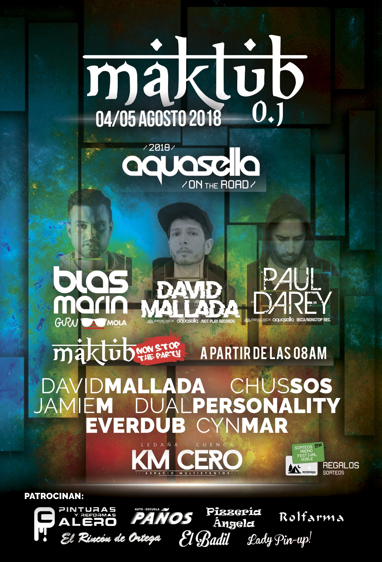 Su primera edición, MAKTUB 0.1, tiene lugar en KM0, una sala multieventos ubicada en Ledaña, provincia de Cuenca, en la que esperan recibir a más de mil personas y en la que tienen el orgullo por primera vez traer un Pedazo de uno de los mejores festivales de música electrónica de España, Aquasella, que se celebra en Arriondas (Asturias) y que pincharan música djs de ámbito nacional e internacional también contarán con artistas de la provincia de Albacete y harán bailar a la gente al ritmo de su música.