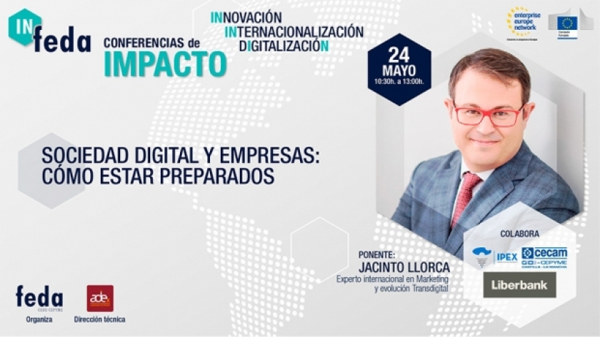Continúa el Programa “IN-FEDA 2019, Conferencias de Impacto”, enfocado principalmente a la Innovación-Internacionalización-Digitalización. Esta tercera sesión, con la colaboración de Liberbank y la participación de IPEX y CECAM, estará dedicada íntegramente a la sociedad digital y la preparación que tienen y necesitan las empresas. Será en la mañana del próximo viernes, día 24, desde las 10,30.