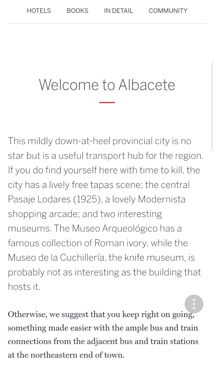 Ahora, y tras la denuncia de otro lector, comprobamos que han quitado esa ‘frasecita’ pero definen a Albacete como una «ciudad de provincias poco elegante» y dicen que «no es una estrella» pero sí un nudo de transportes para la región.