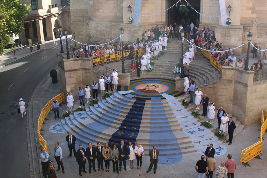 El alcalde de Albacete, Vicente Casañ, ha tenido la oportunidad de admirar la calidad artística de la alfombra de serrín que han confeccionado alfombristas de Elche de la Sierra en la escalinata de la Catedral para recibir a las reliquias de Santa Bernadette, un acto promocionado por la Hospitalidad Nuestra Señora de Lourdes.