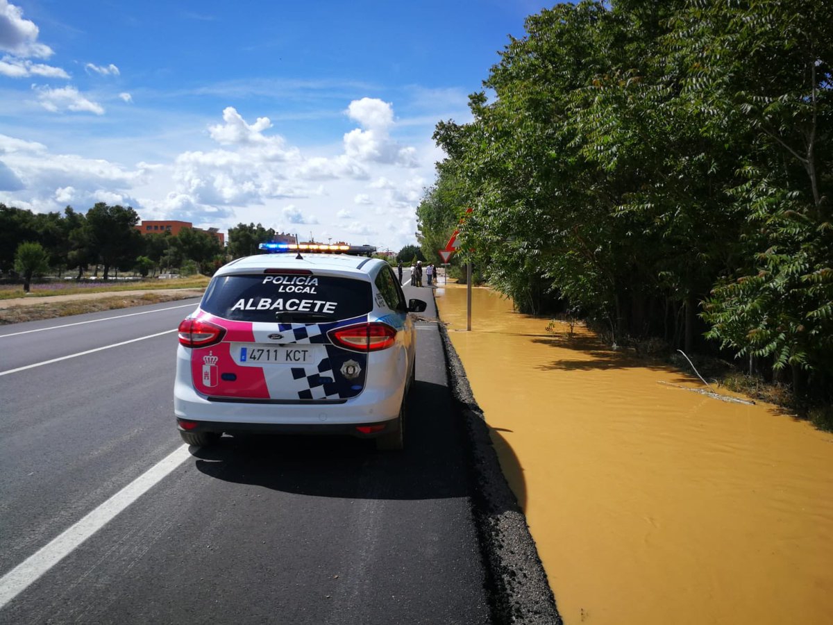 Los Bomberos de la Albacete, con el apoyo de la Policía Local en el operativo, trabajan en la rambla Escartina, limpiando a la altura de La Casita para evitar el desbordamiento de la rambla en esta zona de la carretera de Valencia, en uno de los accesos a la ciudad de Albacete.