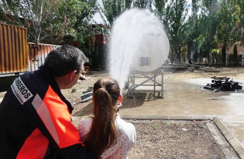 También se desarrollan talleres prácticos sobre el uso de extintores y formación ante otras circunstancias de riesgo en casa como, por ejemplo, una sartén con aceite que se ha incendiado en la cocina, fugas de gas, o fuegos eléctricos. Para finalizar la visita, se realiza una exposición de vehículos y de material de intervención de los Bomberos de Albacete.
