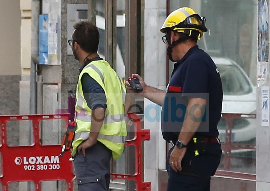 Los Bomberos de Albacete, junto a operarios de las obras de peatonalización en la calle Tinte, miden el nivel de incidencia del gas, mientras el centro sigue cerrado a vehículos y peatones.