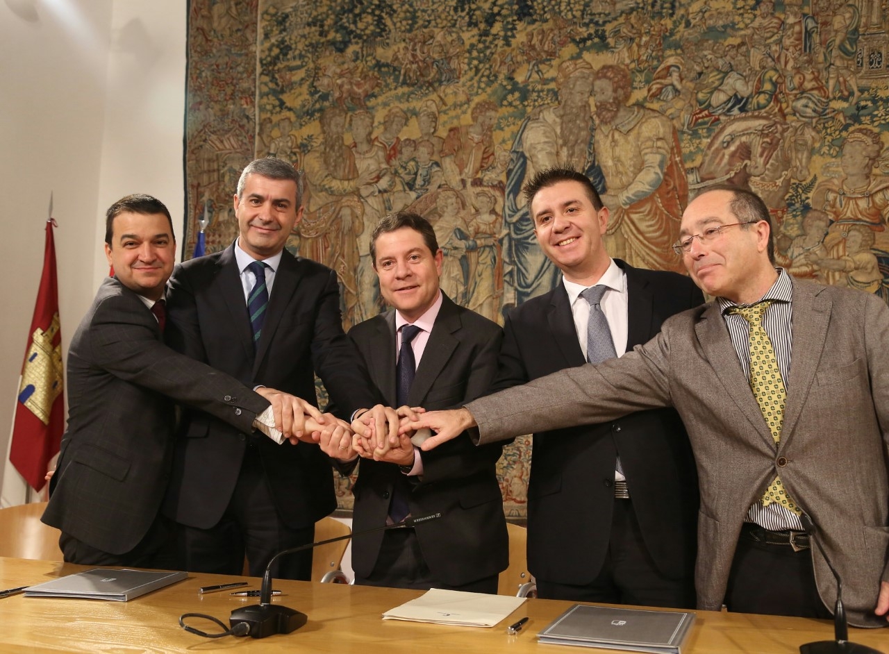 El presidente de la Diputación de Albacete, Santiago Cabañero, ha firmado hoy en Toledo un convenio con el Gobierno regional para la adecuación y mejora de los caminos rurales, un acto presidido por el jefe del Ejecutivo castellano-manchego, Emiliano García-Page, y en en el que también han estado presentes el consejero de Agricultura y Medio Ambiente, Francisco Martínez Arroyo y el presidente de la Diputación de Toledo, Álvaro Gutiérrez, quien también ha rubricado un convenio similar.