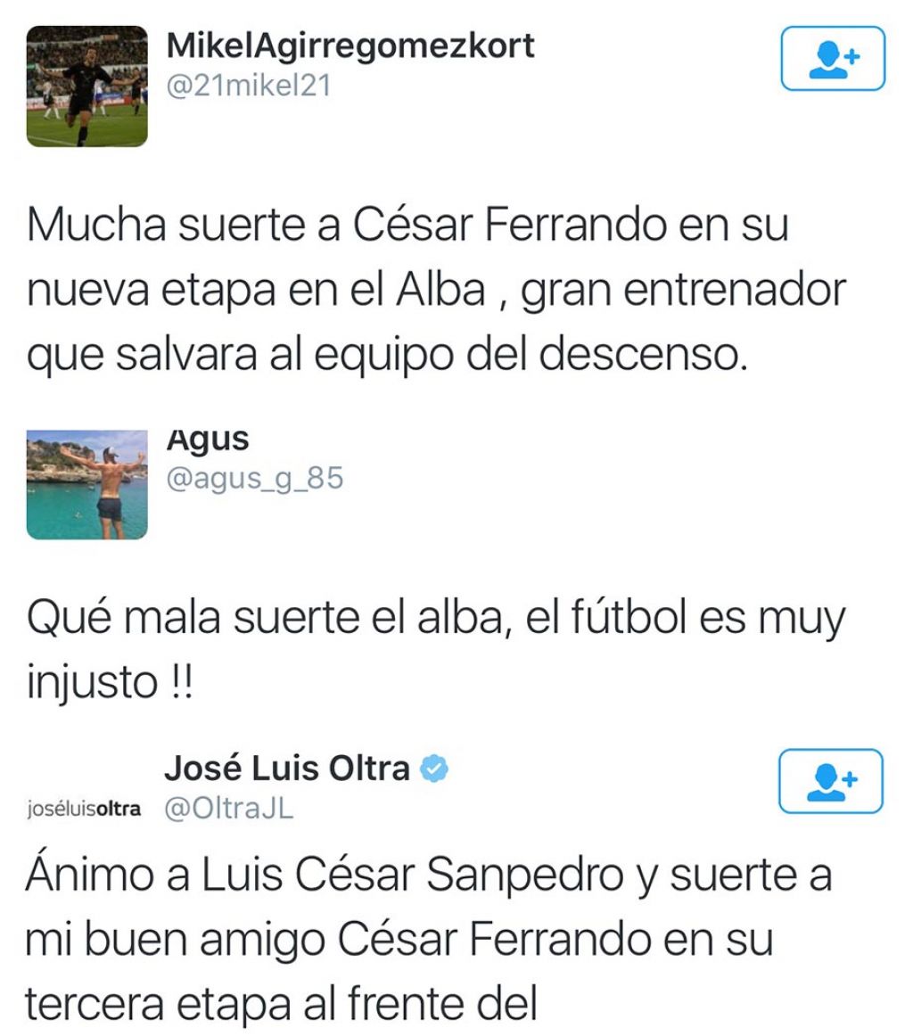 Ex del Alba como Agus, que se fue en el mercado de invierno del equipo, escribía en su cuenta de Twitter desde Houston que qué injusto es el fútbol y vaya mala suerte la del Alba. Además, Mikel, ex también del Alba, deseaba mucha suerte a César Ferrando y se mostraba convencido de que «es un gran entrenador que salvará al equipo del descenso». José Luis Oltra, entrenador del Córdoba, daba ánimos a Luis César y deseaba suerte «a mi gran amigo César Ferrando en el Alba».