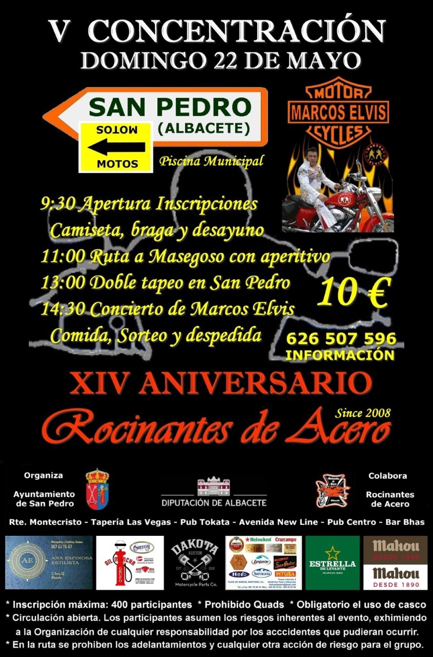 El Ayuntamiento de San Pedro colabora en la V Concentración de Motos, un evento que se celebrará el próximo domingo día 22 de mayo, organizado por Rocinantes de Acero, asociación que celebra su XIV Aniversario en este año 2022. La Piscina Municipal de San Pedro acogerá la llegada de los participantes, a las 09:30 horas, momento en el que todos los inscritos recibirán una camiseta y una braga, además del desayuno.