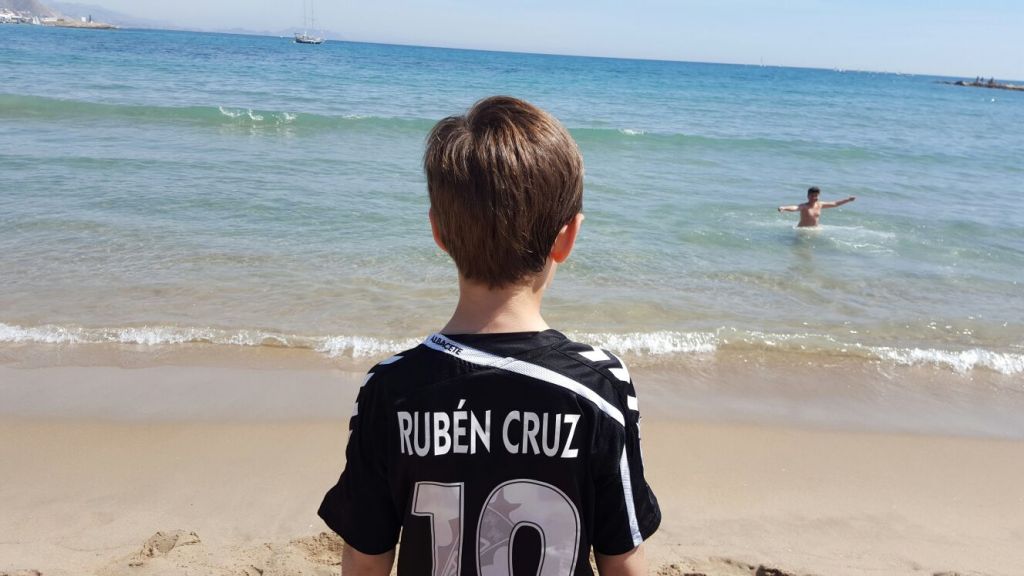 Desde las playas de Alicante nos llega esta imagen de un pequeño aficionado del Alba que no olvidó en su maleta la camiseta de uno de sus ídolos, de Rubén Cruz.