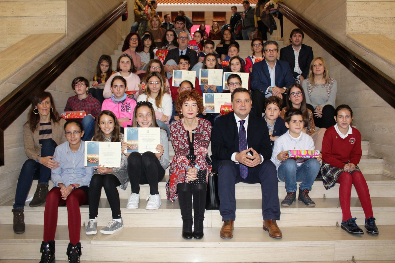 Para agradecer a los 21 concejales infantiles su participación en el VIII Pleno Infantil sobre los Derechos de la Infancia, Manuel Serrano les ha hecho entrega de un diploma acreditativo y ha participado en la entrega de los diplomas y premios correspondientes a la XIX edición del Certamen Infantil de Cuentos que este año, y a propuesta de UNICEF, está dedicado a la Paz y a la no violencia, felicitando a los 70 alumnos de 5º y 6º de Primaria de los 6 centros educativos de la capital y pedanías participantes por la calidad de sus trabajos y los mensajes tan importantes que transmiten y, en especial a los colegios ganadores: Mª Llanos Martínez, Parque Sur, Aristos y Pedro Simón Abril de Santa Ana.