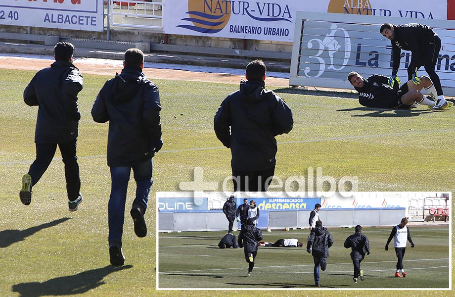 Los médicos y el fisioterapeuta del Albacete Balompié están en forma y lo demuestran en cada entrenamiento. Es tanto el temor a las lesiones, después de haber sumado hasta nueve bajas a la vez en la primera vuelta, que cada vez que un jugador tiene un susto en un entrenamiento, salen a la carrera. Así les hemos visto varios días, como muestran estas imágenes tomadas en el entrenamiento del jueves en el Carlos Belmonte.