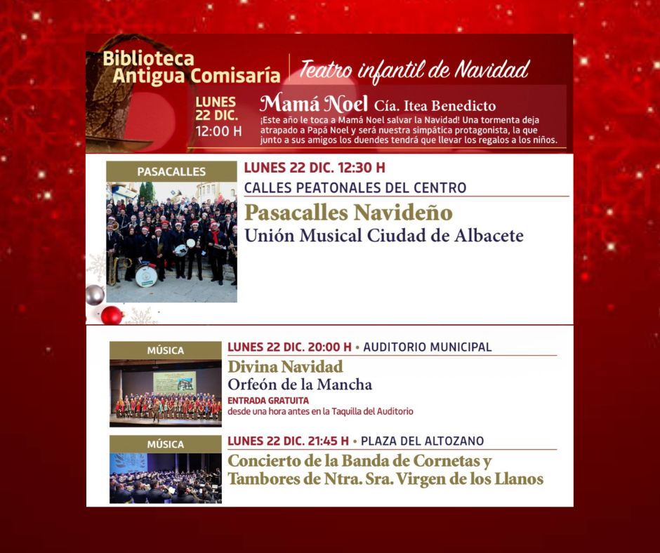 Ya por la tarde, la música coral tomará el protagonismo en el Auditorio Municipal, donde a las 20:00 horas tendrá lugar el concierto ‘Divina Navidad’, a cargo del Orfeón de la Mancha, con entrada gratuita desde una hora antes en taquilla.