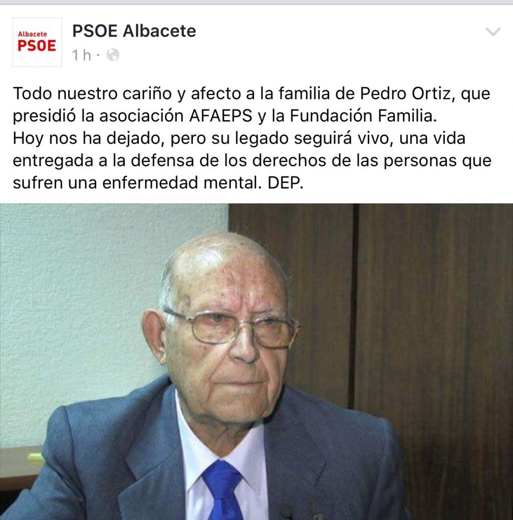 Pedro Ortiz, que presidió AFAEPS y la Fundación Familia, ha fallecido este viernes, como lo detalla el PSOE en su cuenta de Facebook. Fue todo un referente en el asociacionismo albaceteño, en el sector sociosanitario, que hoy llora su pérdida. Nos sumamos a las muestras de ánimo a su familia.