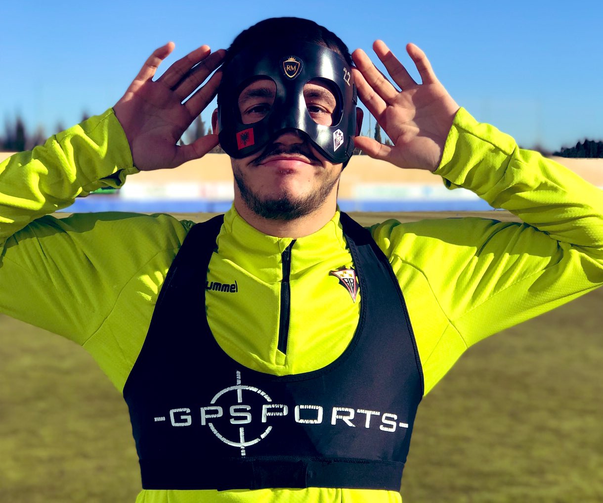 Curiosa la personalización con su dorsal y el escudo del Alba que ha hecho Rei Manaj de su máscara, que ya ha llevado al entrenamiento de hoy, como se aprecia en esta imagen difundida por el Albacete Balompié en sus redes sociales.