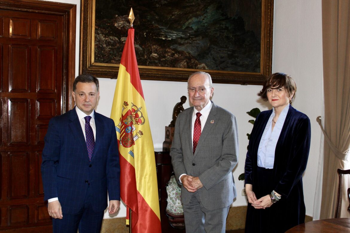 Manuel Serrano, que estaba acompañado por la concejala de Cultura Elena Serrallé, ha mantenido el encuentro en el Ayuntamiento de Málaga y ha aprovechado para intercambiar opiniones sobre diversos aspectos de la gestión municipal.