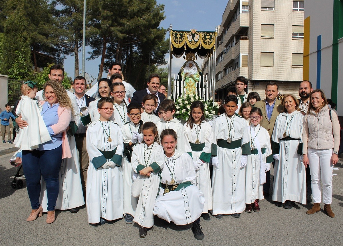 La procesión infantil ha partido de la Capilla de Nuestra Señora de Las Angustias, recorriendo las calles Ángel, Avenida de España, Muñoz Seca, Cristóbal Lozano, Doctor Beltrán Mateos y Plaza de Santa Teresa de Jesús Jornet, hasta llegar a la residencia de ancianos ‘San Antón’, donde ha tenido lugar un encuentro entre residentes y nazarenos infantiles y se ha interpretado el Himno Nacional.