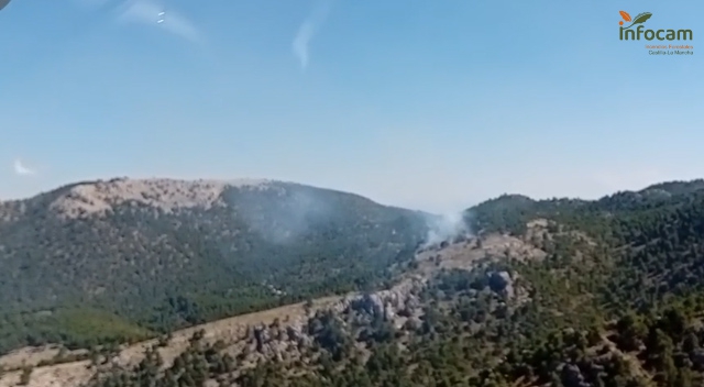 Efectivos del Infocam trabajan en la Sierra de las Cabras, en la pedanía de Pedro Andrés de Nerpio, en la Sierra del Segura, en un incendio forestal que se declaraba antes de las cinco de la tarde y donde trabajan decenas de efectivos, junto a medios aéreos y terrestres, como ha informado el Gobierno regional.