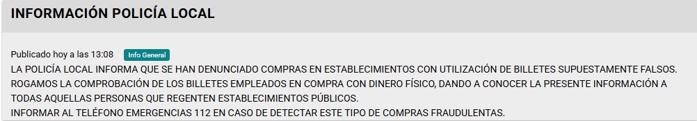 El Ayuntamiento de Casas Ibáñez publicaba, este lunes, un bando móvil de la Policía Local, ante la advertencia de que habría quien estaría intentando pagar con billetes supuestamente falsos en establecimientos de la localidad.