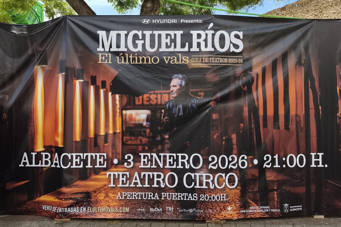 No se anuncia todavía en su web, ni se ha comunicado aún por otra vía, pero en la Feria de Albacete ya puede verse la publicidad del concierto que Miguel Ríos traerá al Teatro Circo de Albacete, el 3 de enero de 2026, con su gira de teatros.