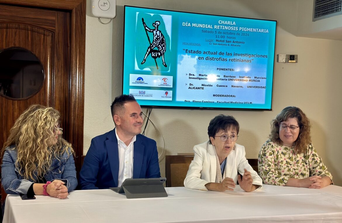 La conferencia ha sido impartida por los investigadores Marta Agudo Barriuso y Nicolás Cuenca Navarro, con el tema ‘Estado actual de las investigaciones en distrofias retinianas’. Como moderadora ha actuado Elena Caminos, de la Facultad de Medicina de Albacete.