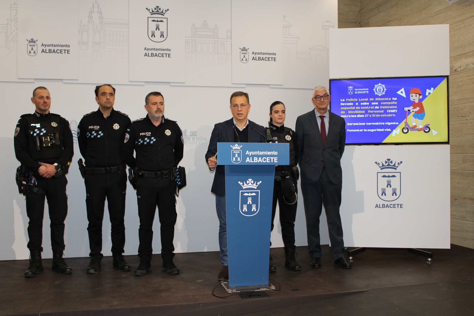 El alcalde de la ciudad, Manuel Serrano, y el intendente jefe de la Policía Local de Albacete, Mario Rubio, junto al concejal de Seguridad, Alberto Reina, y el inspector Luciano Rosillo, han informado del balance de la primera campaña de control de Vehículos de Movilidad Persona, VMP, que ha tenido lugar en nuestra ciudad durante del 27 a 31 del pasado mes de octubre con el objetivo de informar y concienciar sobre el uso adecuado de este medio de transporte y sancionar a aquellos que incumplen las normas.