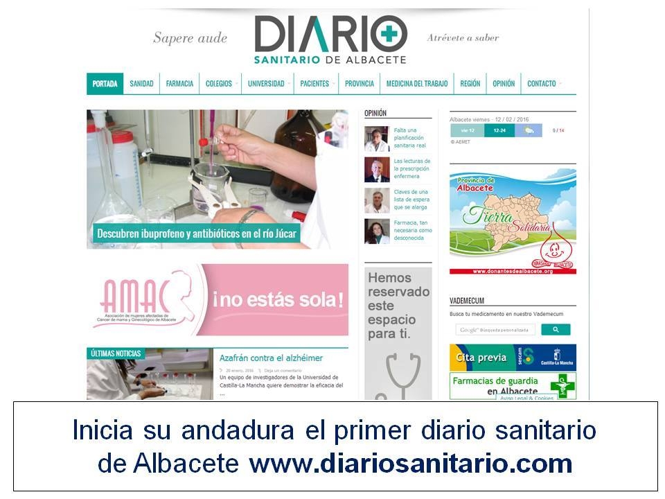 Este lunes, 15 de febrero, nace Diario Sanitario (www.diariosanitario.com), el primer periódico digital albaceteño centrado en temas sanitarios. En él tendrán cabida a diario opinión, nuevas investigaciones, éxitos médicos, hospitales, facultades o colegios profesionales.