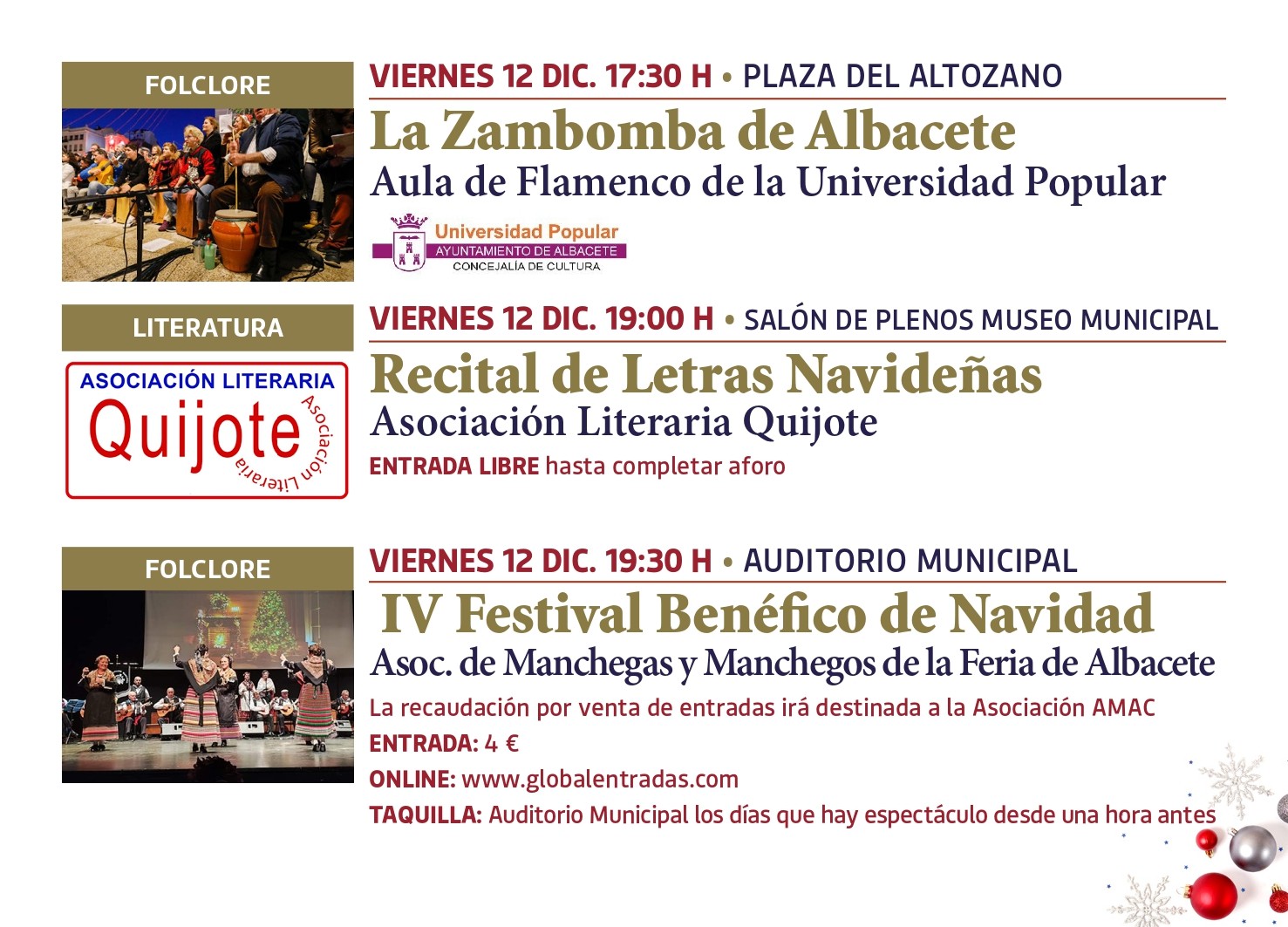 La jornada concluirá a las 19:30 horas en el Auditorio Municipal con el IV Festival Benéfico de Navidad, a cargo de la Asociación de Manchegas y Manchegos de la Feria de Albacete. Un espectáculo folklórico solidario cuya recaudación se destinará a la Asociación AMAC, reafirmando el compromiso social del movimiento cultural local y del Ayuntamiento con las causas que fortalecen el tejido asociativo.