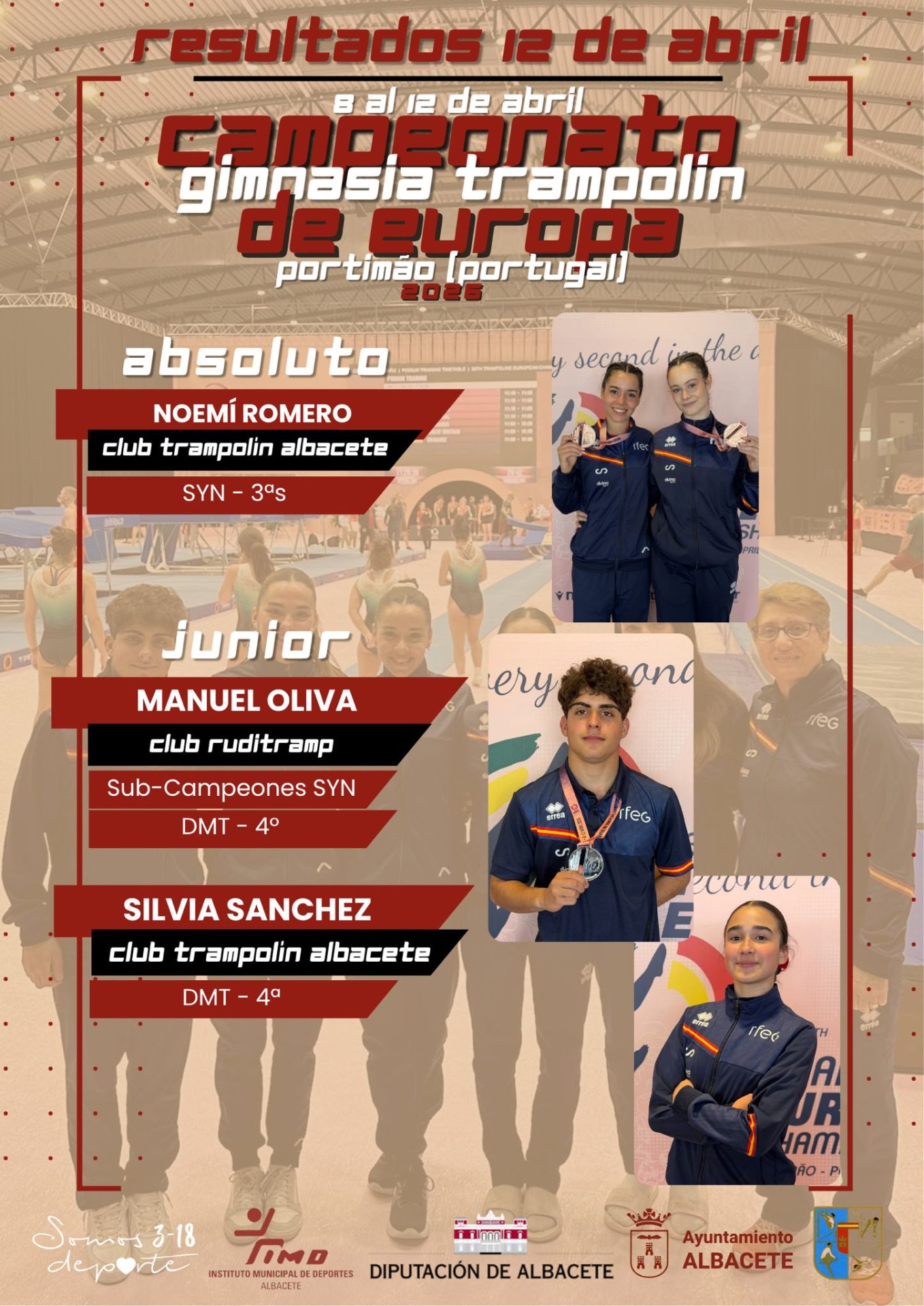 Además, Manuel Oliva, del Club Ruditramp, quedaba cuarto en categoría Junior y Silvia Sánchez, del Club Trampolín Albacete, que ayer se hacía con el Subcampeonato de Europa Junior -también con la albaceteña Belén Sánchez, del Club Aerotramp, quedaba hoy cuarta en individuales.