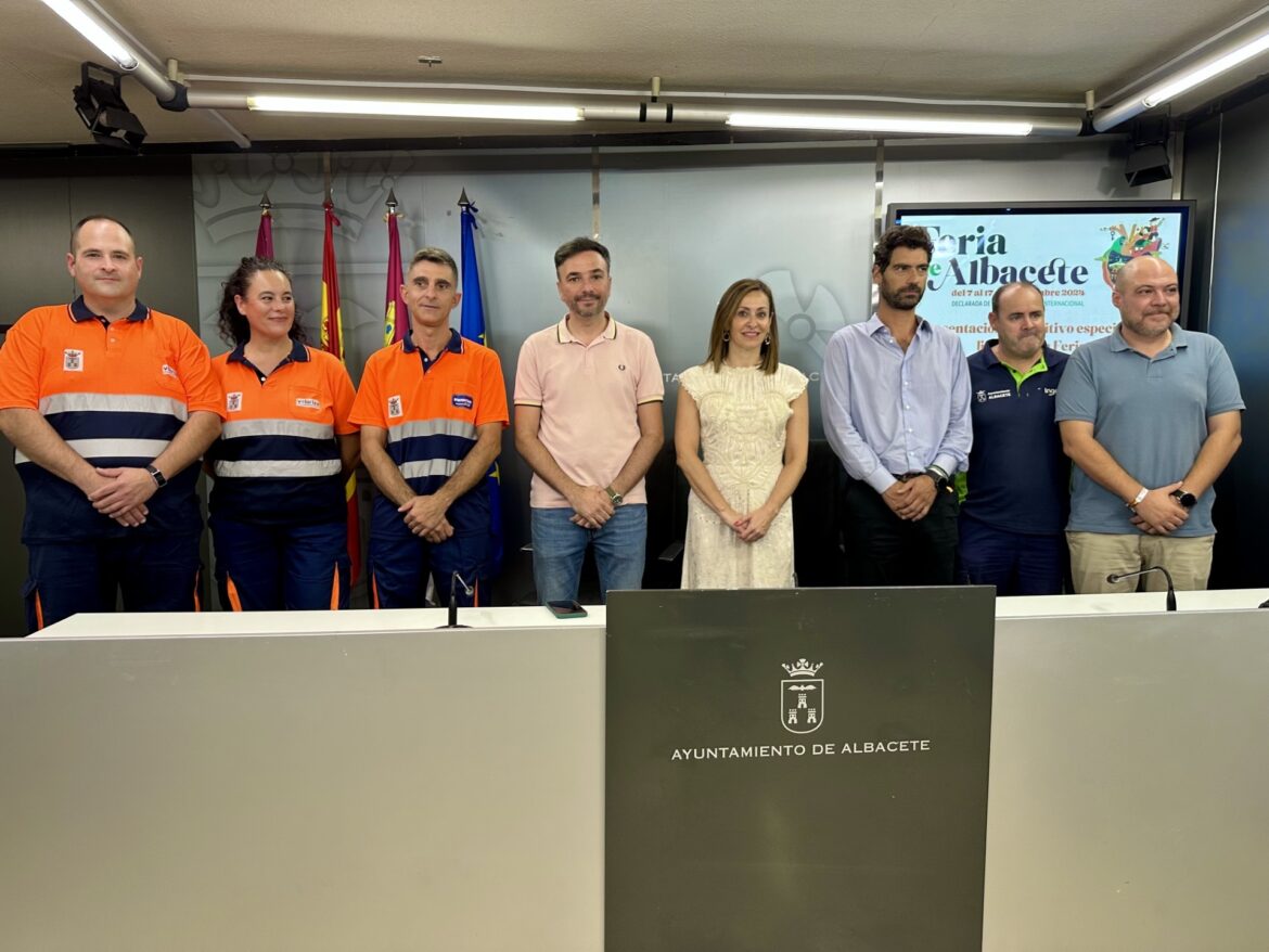 La concejala de Medio Ambiente, Rosa González de la Aleja, ha presentado el dispositivo de limpieza especial para la Feria 2024, acompañada de representantes de las empresas concesionarias de limpieza viaria y recogida de residuos urbanos y del mantenimiento de zonas verdes: el gerente de Valoriza en Albacete, Carlos Rubio; el representante del Comité de Empresa de limpieza, Telesforo Martínez; el gerente de Ingesan, Óscar de Campo; y el presidente del comité de empresa de zonas verdes, David Sánchez