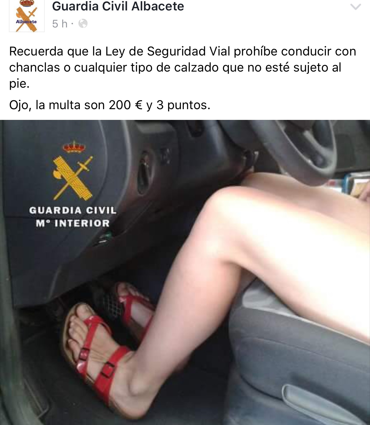 La Guardia Civil de Albacete ha recordado hoy a través de sus redes sociales una sanción que quizás muchos conductores no tienen del todo clara. Se trata de la multa si te pillan conduciendo con chanclas o sandalias que no estén atadas al pie. La sanción es de 200 euros y esto implica, además, la pérdida de tres puntos en el permiso de conducir.