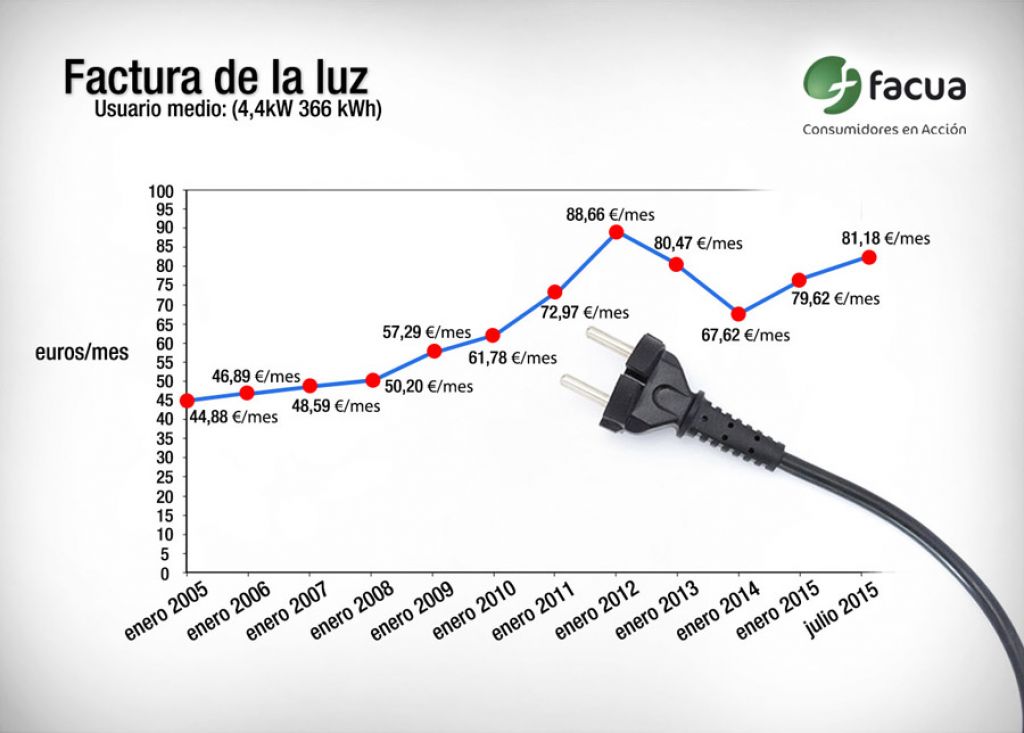 Con las tarifas vigentes entre agosto de 2014 y julio de 2015, el usuario medio acogido al denominado Precio Voluntario para el Pequeño Consumidor (PVPC) ha pagado 929,15 euros por las facturas de la electricidad (una media de 77,43 euros mensuales), frente a los 529,32 (44,11 al mes) que abonaba con la tarifa aprobada por el Gobierno en 2004. Según los análisis de FACUA sobre más de 50.000 facturas de viviendas ocupadas, el usuario medio en España consume 366 kWh mensuales y tiene una potencia contratada de 4,4 kW.