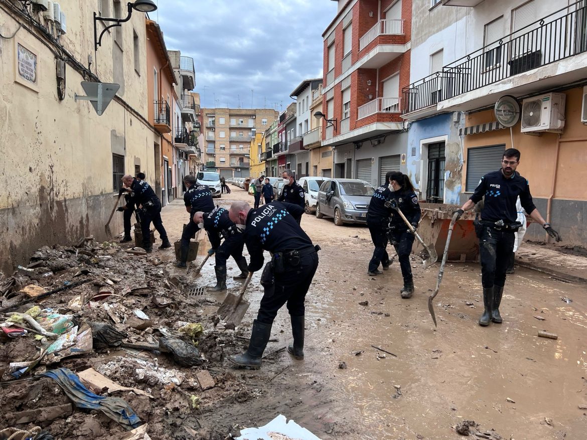 Los 11 agentes de la Policía Local de Albacete que ayer viajaron a la Comunidad Valenciana, de manera voluntaria y altruista, para ayudar a las personas que se han visto gravemente afectadas por las inundaciones, están ya realizando sus funciones competenciales en la localidad de Algemesí y, de manera especial, prestando servicios asistenciales, control de movilidad y tareas de limpieza, sobre todo en las viviendas afectadas, en respuesta a la petición realizada por la alcaldesa valenciana, María José Catalá.