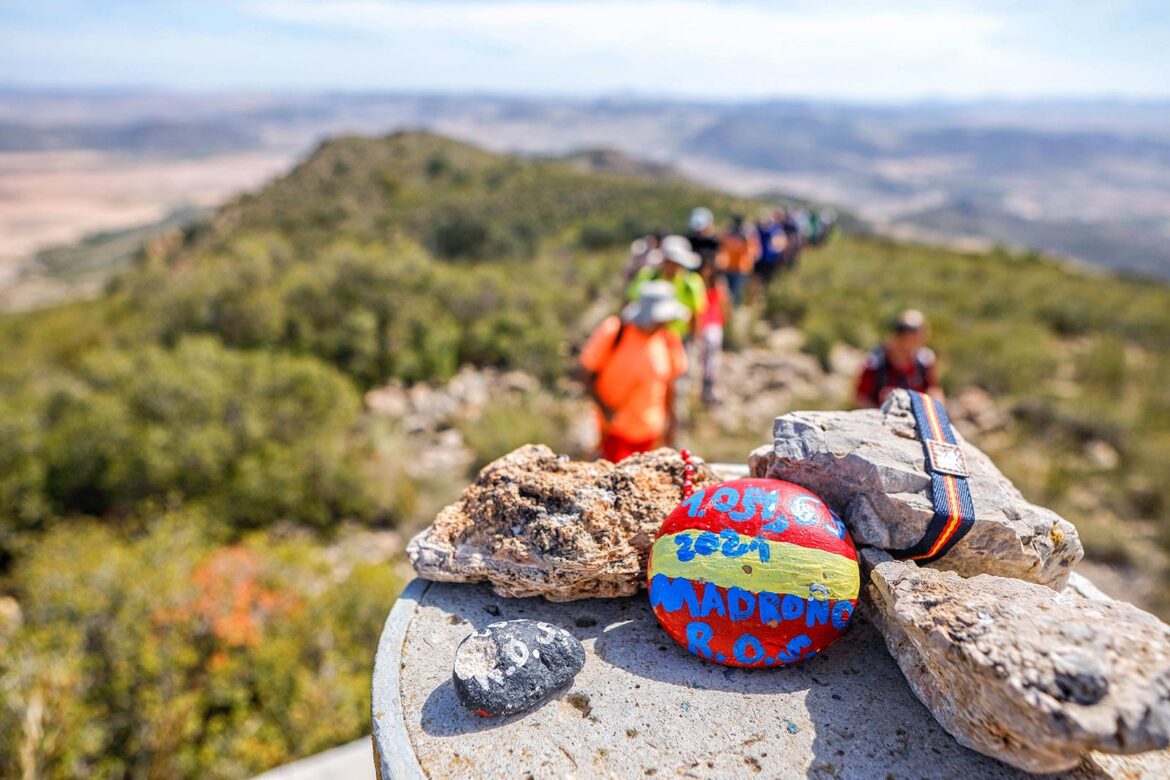 Aquí, unos bajaron a la Fuente de los Perales y a la zona del Merendero; y otros, la gran mayoría, ascenderían a la cumbre del Madroño de 1.054 metros de altura, con un desnivel muy exigente, lugar donde se sitúa el vértice geodésico, punto más alto de los Campos de Hellín, conocido como El piquete de la Madama. Con unas impresionantes vistas, desde donde ver municipios como como Albatana, Tobarra, Fuente Álamo y Ontur, entre otros.