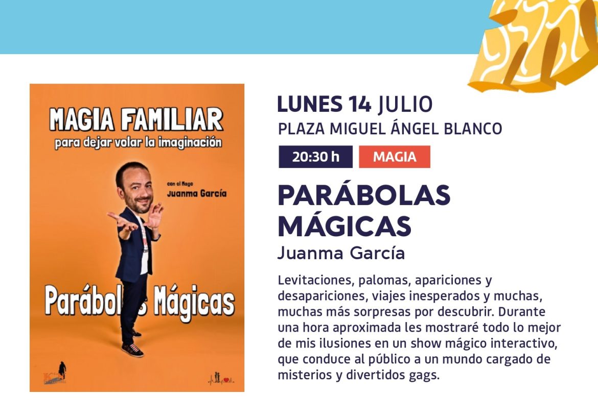 La ilusión, la sorpresa y el humor se darán cita mañana lunes, 14 de julio, en la Plaza Miguel Ángel Blanco con el espectáculo Parábolas Mágicas, a cargo del mago Juanma García. A partir de las 20:30 horas, vecinos y visitantes podrán disfrutar de una tarde mágica para todos los públicos, dentro de la programación del Verano Cultural 2025.