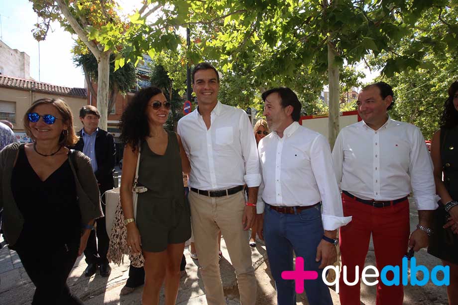 El secretario general del PSOE, Pedro Sánchez, que hoy visita la Feria de Albacete, ha estado este mediodía en la caseta de FEDA, junto al Recinto Ferial. Ha conversado, entre otros, con el presidente de FEDA, Artemio Pérez.