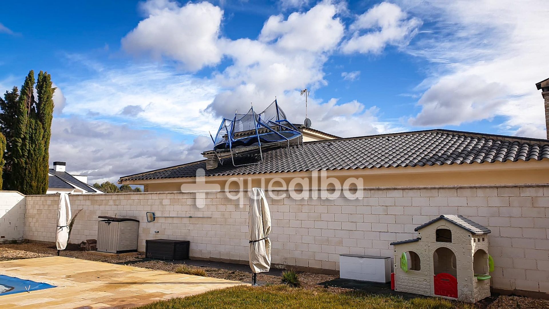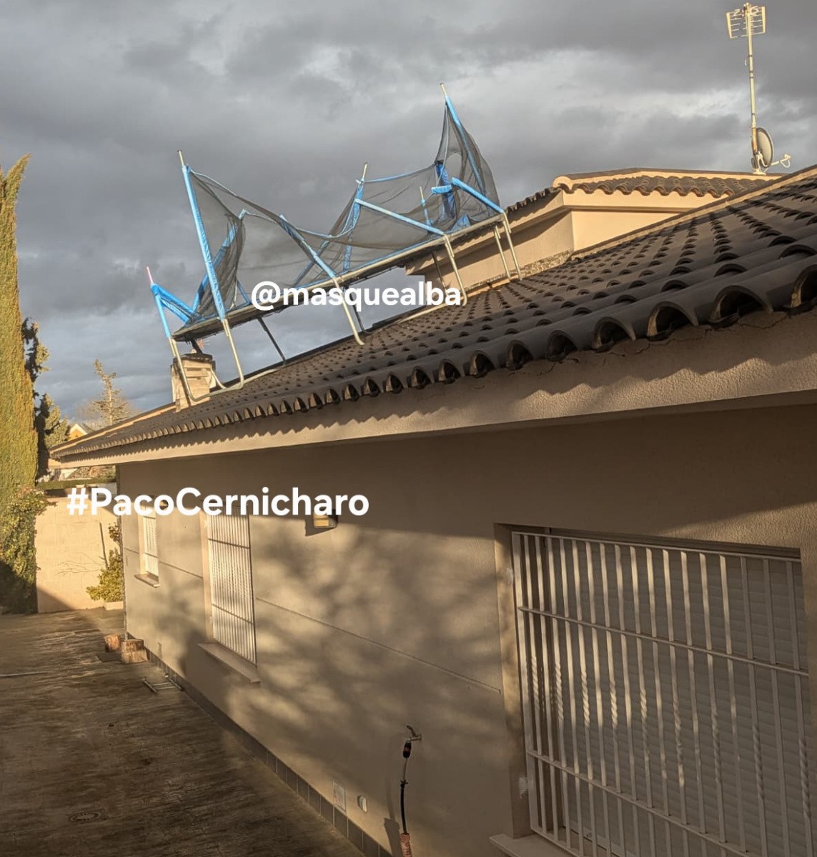 Paco Cernicharo, propietario de la vivienda en cuyo tejado se ha quedado encajada la colchoneta de sus vecinos, ha explicado a Masquealba -pasadas las 17,30 horas- que sobre las tres de la tarde les avisó el vecino, propietario de la colchoneta al vuelo de lo que había pasado.