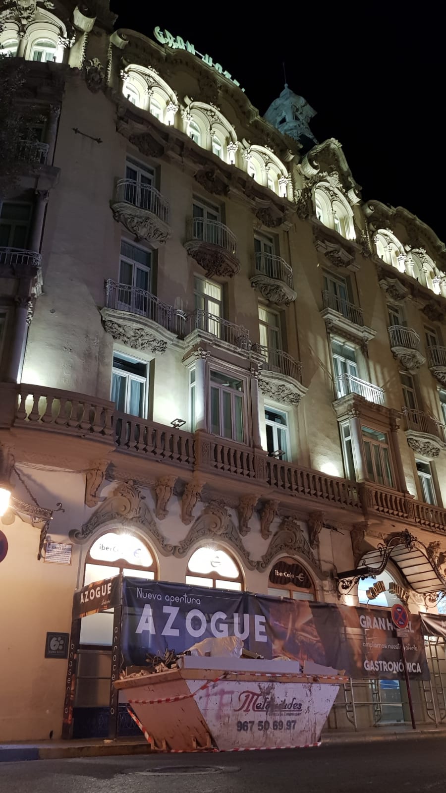 A los meses que tienen que sumar contar con andamios en su fachada mientras que la obra que les pidió el Ayuntamiento por el desprendimiento de un elemento de la misma recibe el visto bueno de Cultura -al ser un edificio con protección en el centro de Albacete- ahora los responsables del Gran Hotel tienen que sufrir el contenedor de obra que les han colocado en su puerta.