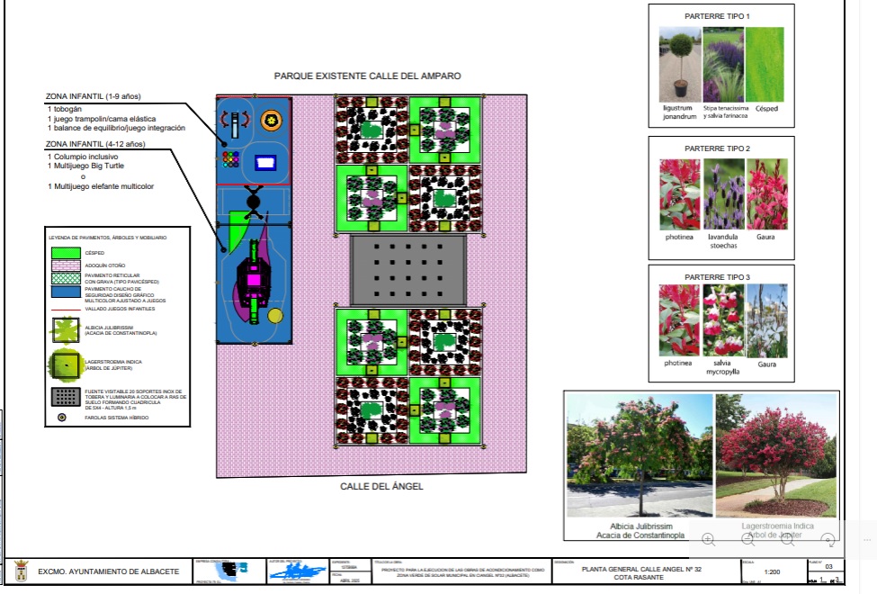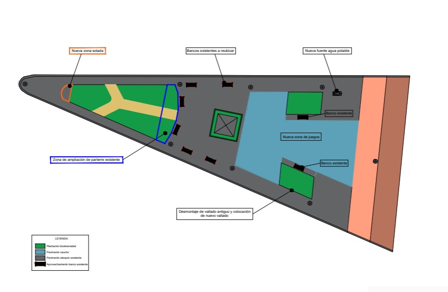 Se instalará una fuente de agua potable nueva, valla metálica de colores de 90 cm de altura en el área de juegos infantiles, valla metálica de colores de 50 cm de altura en la zona de parterres anexa, parterres de plantación de biodiversidad delimitados por postes unidos con cuerdas, y carteles informativos sobre los beneficios medioambientales de la plantación de biodiversidad. El área de juegos infantiles tendrá una superficie total de 179 metros cuadrados, con juegos inclusivos y pavimento sintético de absorción de impactos. Se plantarán especies autóctonas como tomillo. romero, espliego, salvia, jara y ajenio, y para el arbolado se han elegido las especies de cerezo y granado.