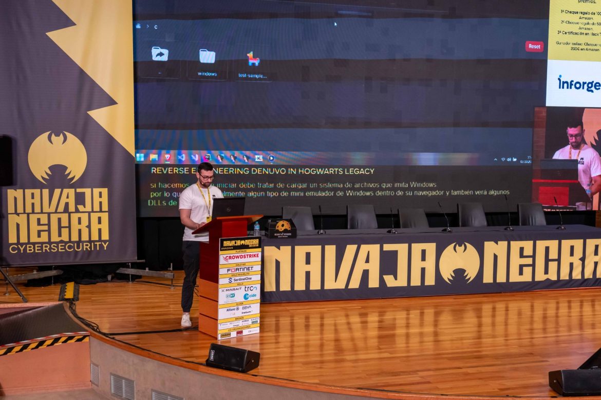 En primer lugar, la talla internacional de los ponentes que están participando en este congreso. A lo largo de la jornada del viernes tomaron protagonismo ponentes llegados de Argentina, Alemania y Polonia. Ricardo Narvaja ofreció una interesante charla sobre el “envenenamiento” del caché de activación en Windows, una de las ponencias más esperadas y que prácticamente abarrotó la Sala Crowdstrike para escuchar a uno de los mayores expertos mundiales en la materia. Le siguió Maurice Heumann, desde Alemania, que repite en Navaja Negra por segundo año consecutivo. En este caso abordó el funcionamiento interno de Denuvo Anti-Tamper, una de las soluciones DRM más ampliamente desplegadas en la industria del videojuego. Y lo hizo en inglés, con la traducción simultánea del sistema ‘Miguelito’ creado por la propia Organización para facilitar el seguimiento de las charlas. Y completó el trío internacional Duncan Ogilvie, llegado desde Polonia, quien ofreció un taller sobre ofuscación, la técnica que se utiliza para proteger aplicaciones de software contra ataques maliciosos y accesos no autorizados.